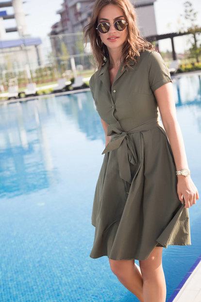 kuşaklı haki elbise modeli
